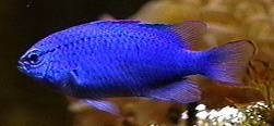 Identification: Its coloration is bright blue overall with a black line through the eye and an eye spot on the upper rear of the fish.